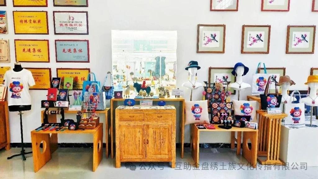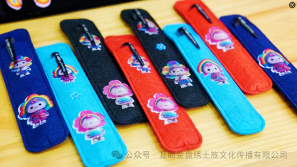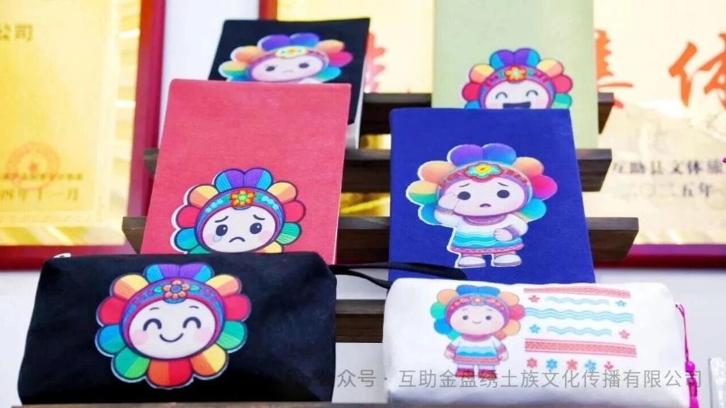 值得关注的是,在东西部协作框架下,基地已与江南大学设计学院构建深度校企合作体系:双方以“青行·赋能·传承”为主题,本着优势互补、资源共享、互利共赢、共同发展的原则,签订战略合作协议,明确在建立学生文化实践基地、研学基地及文创产品设计研发等方面开展长期合作。江南大学设计学院陈香副教授团队深入挖掘土族文化与盘绣工艺精髓,为基地量身打造全新形象IP“虹珞珞”——该形象以彩虹与盘绣太阳花为核心设计符号,结合太阳花的土语“廓日洛”,寓意“彩虹之乡·绣线传承”,兼具现代审美与民族韵味。依托这一IP,公司团队进一步开发出腕带、包包、钥匙扣、首饰、书衣等系列文创产品,有效提升盘绣产品的设计感与市场吸引力,实现传统文化与现代消费需求的精准对接,为国家级非物质文化遗产土族盘绣注入高校智慧与现代设计力量。
