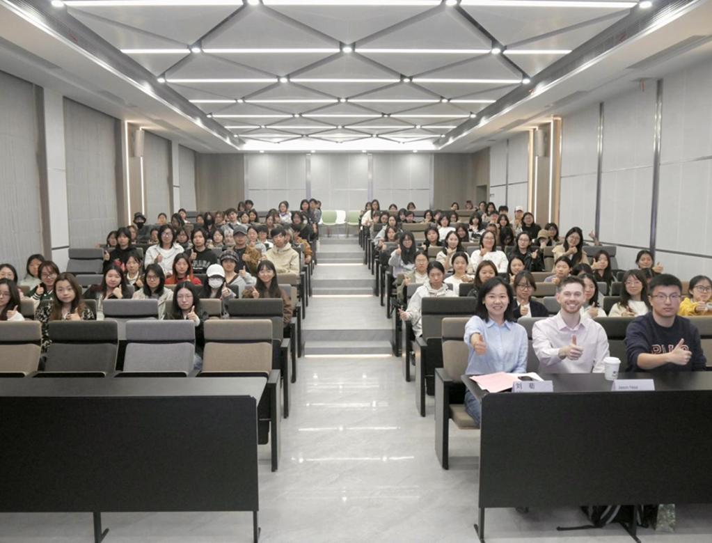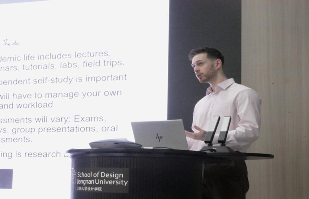 在随后的核心环节,Jason Neal重点解读了江南大学设计学院与利兹大学设计学院合作的“1+1+1”硕士双学位联合培养项目。他详细说明该项目的培养模式、对接的专业方向、录取要求、申请流程及截止日期,并特别强调为我院成功申请该项目的学生,提供高达20%的学费减免奖学金这一重磅福利。互动环节,在场学生就专业课程细节、住宿生活、职业发展等关心的问题踊跃提问,Jason先生一一给予细致解答,现场交流热烈。