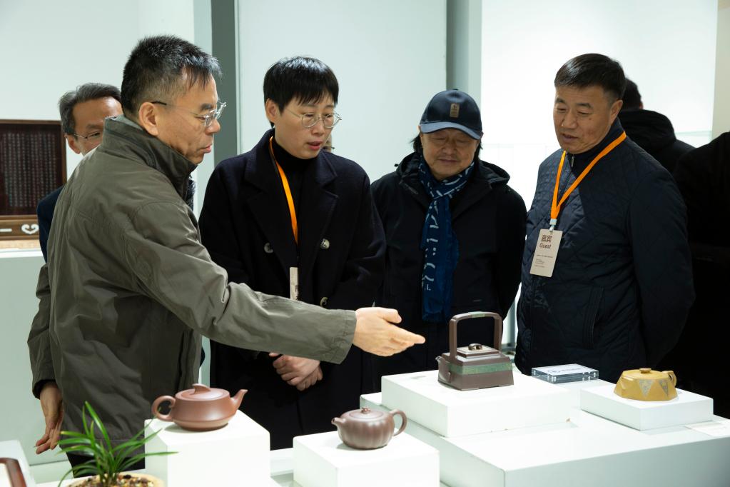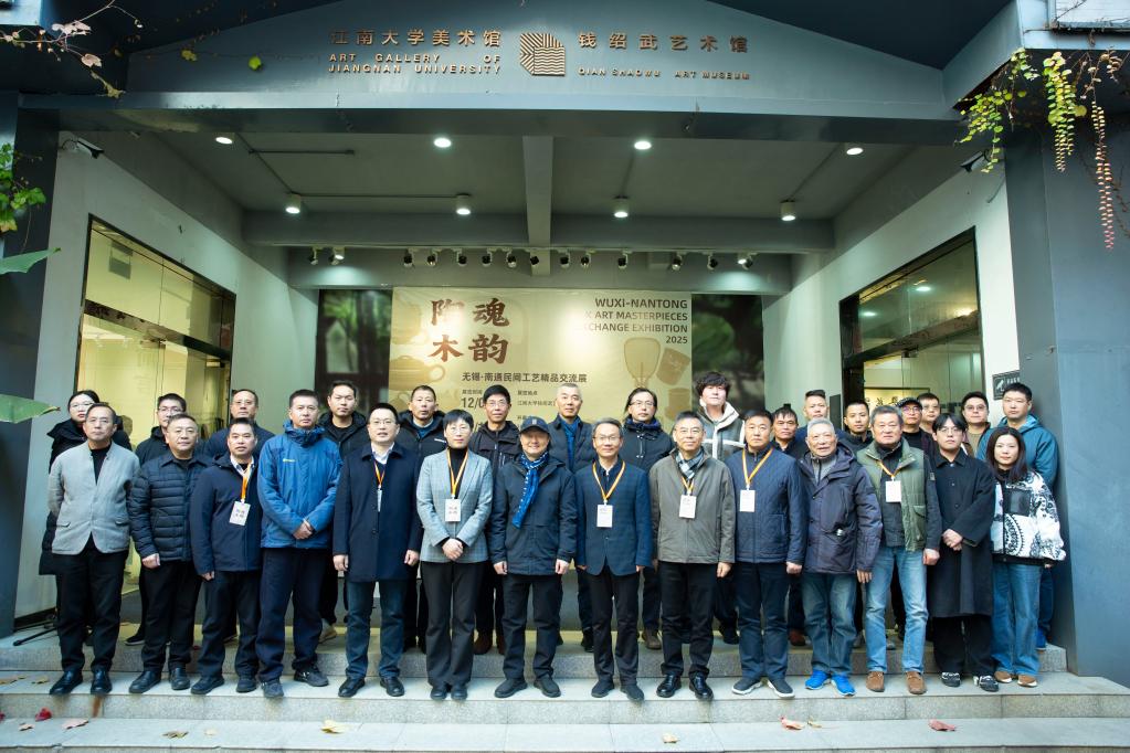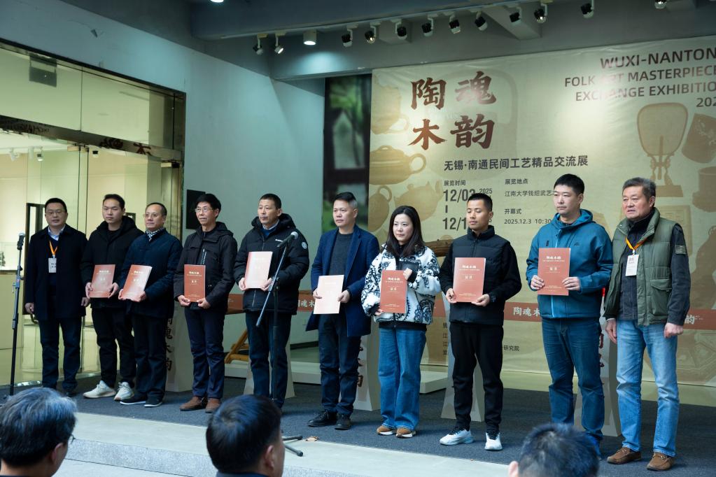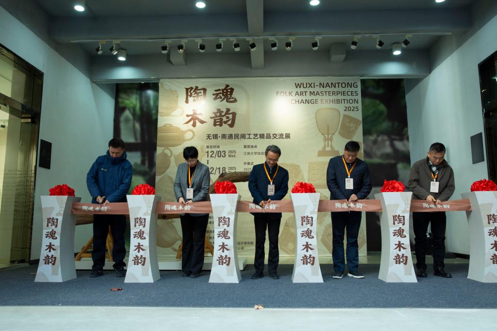 2025年12月3日,由江苏省民间文艺家协会、无锡市文联、南通市文联联合主办,无锡市民协、南通市民协承办,江南大学设计学院、江南大学中国紫砂艺术设计研究院、宜兴紫砂九隽陶艺有限公司协办的“陶魂木韵”——无锡·南通民间工艺精品交流展,在江南大学钱绍武艺术馆隆重开幕。中国民间文艺家协会副主席、江苏省民间文艺家协会主席吴元新,江南大学党委宣传部部长李佳敏,无锡市文联主席娄子丹,南通市文联党组成员、副主席宋红鑫,江南大学设计学院党委书记王维青,江苏省民协副主席史小明,江苏省民协副秘书长唐华伟,无锡市文联调研员张定明,南通市民协主席王金祥,无锡市民协会主席王峰,以及两地参展艺术家代表等近百人出席仪式。