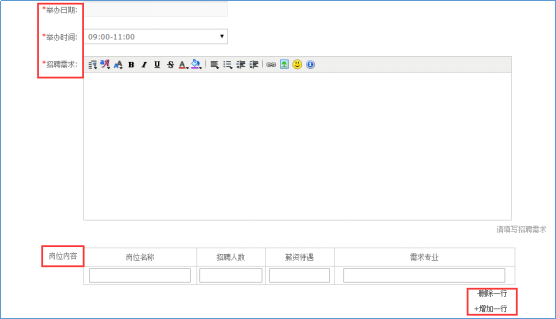 点击招聘公告发布,选择新增,进入招聘公告发布页面,按需求填写完毕后点击提交即申请完成。如下图: