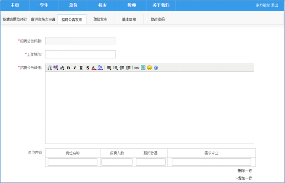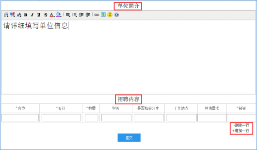 我们可以在单位简介完善单位介绍,增加单位吸引力;最主要的是完善招聘内容,*号为必填内容,完善的招聘内容才是吸引求职学生和通过审核的关键;