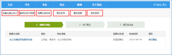 学校发布招聘会展位预定后,企业在招聘会展位预定栏目可以看到该招聘会,点击展位预定即进入展位预定页面,在这里可以详细了解招聘会信息及可预定展位;展位预定报名表截图如下: