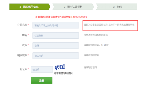 进入单位注册页面。注:(*号标注内容为必填内容;公司名称务必填写营业执照上的名称)单位注册分三步,第一步为填写账号信息,请如实填写,内容如下图。