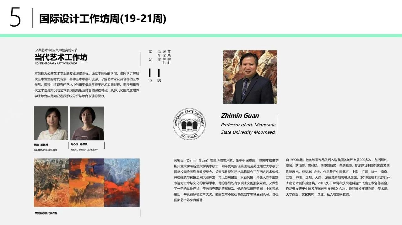 关智民(Zhimin Guan)教授生于中国安徽,1998年获堪萨斯州立大学海斯堡大学美术硕士,同年受聘担任美国明尼苏达州立大学穆尔黑德校园绘画终身教授至今。关智民教授的艺术风格融合了东西方艺术传统,并在抽象与具象之间大胆探索,常以自然景观、水石风景,肖像人体等主题表达对生命与文化的哲学思考。他的作品既有表现主义的抽象元素,又保留了一定的具象描绘,使画面充满动感和层次。他的作品曾在美国、中国等地展出,并获得多项艺术大奖。他的艺术不仅在高校教学领域受到认可,也在国际艺术界享有盛誉。自1990年起,他的绘画作品先后入选美国各地评审展200多次,包括纽约、费城、芝加哥、洛杉矶、华盛顿特区,圣路易斯,明尼阿坡利斯的画廊及博物馆展出,获奖30 余次。作品曾在中国北京、上海、广州,杭州、南京、西安、济南,沈阳,大连、波兰及新加坡等地展出。2010荣获明尼苏达州杰出艺术创作基金奖。2016及2018两次获北达科达州杰出艺术创作基金。作品曾发表于中国及美国画刊报纸30 余次。作品被众多博物馆、美术馆、大学画廊、文化机构,企业,私人收藏家收藏。